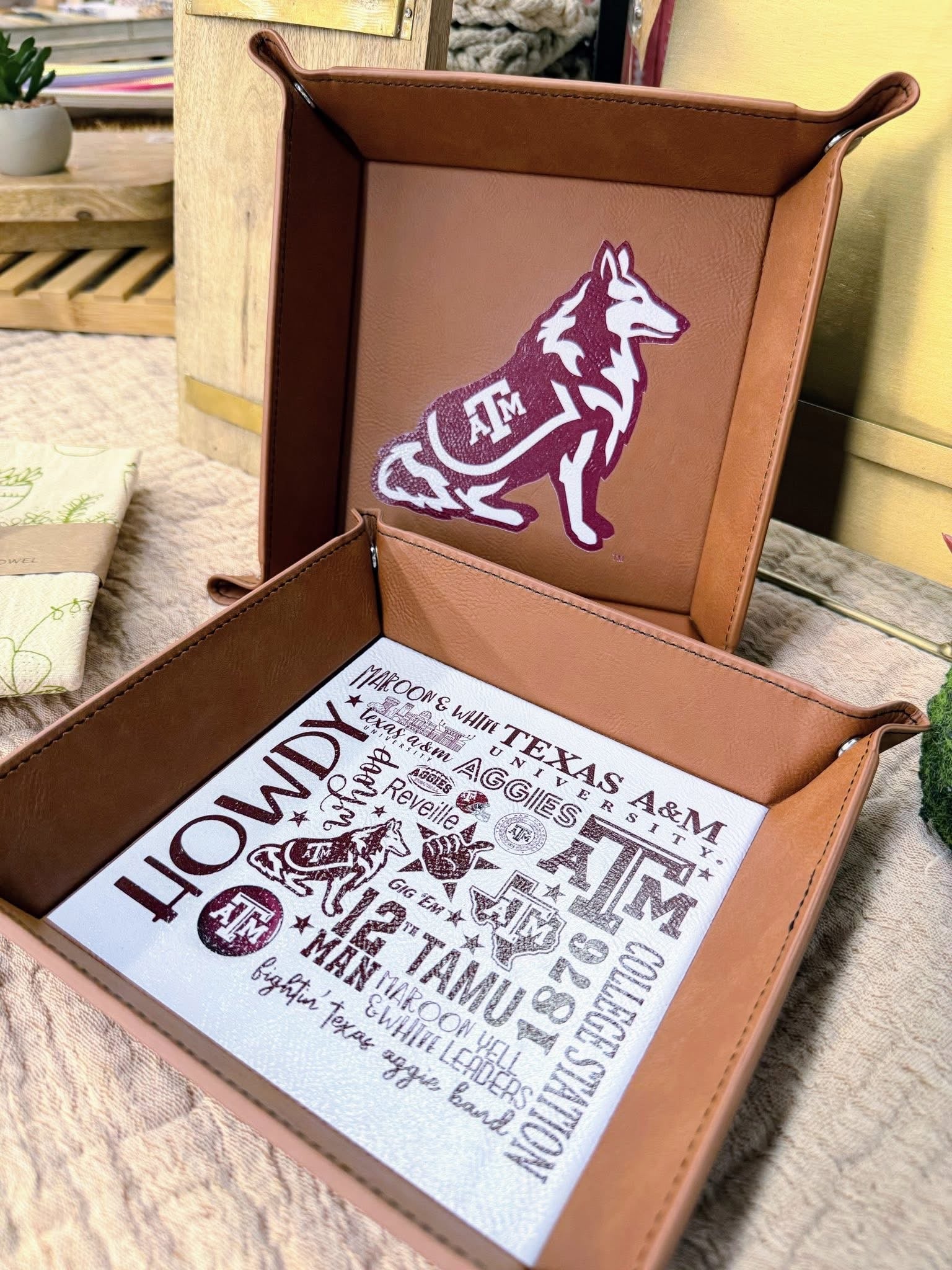 A perfect gift for any Aggie, our leather Aggie Valet Flat-lay Trinket Tray is excellent for home or travel. Unsnap the corners to lay it flat for travel. Inside measures 6x6”.