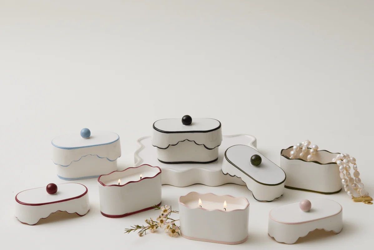 Our 5.5 oz Black Scalloped Candle featuring Black Fig & Olive scent comes in a large ceramic vessel with hand-painted black-and-white details along the scalloped rim and knob. Fragrance notes include green olive leaves, Meyer lemon, black figs, and tonka bean layered over musk and wood. When the candle is finished, the vessel can be repurposed as a trinket dish or decorative accent.