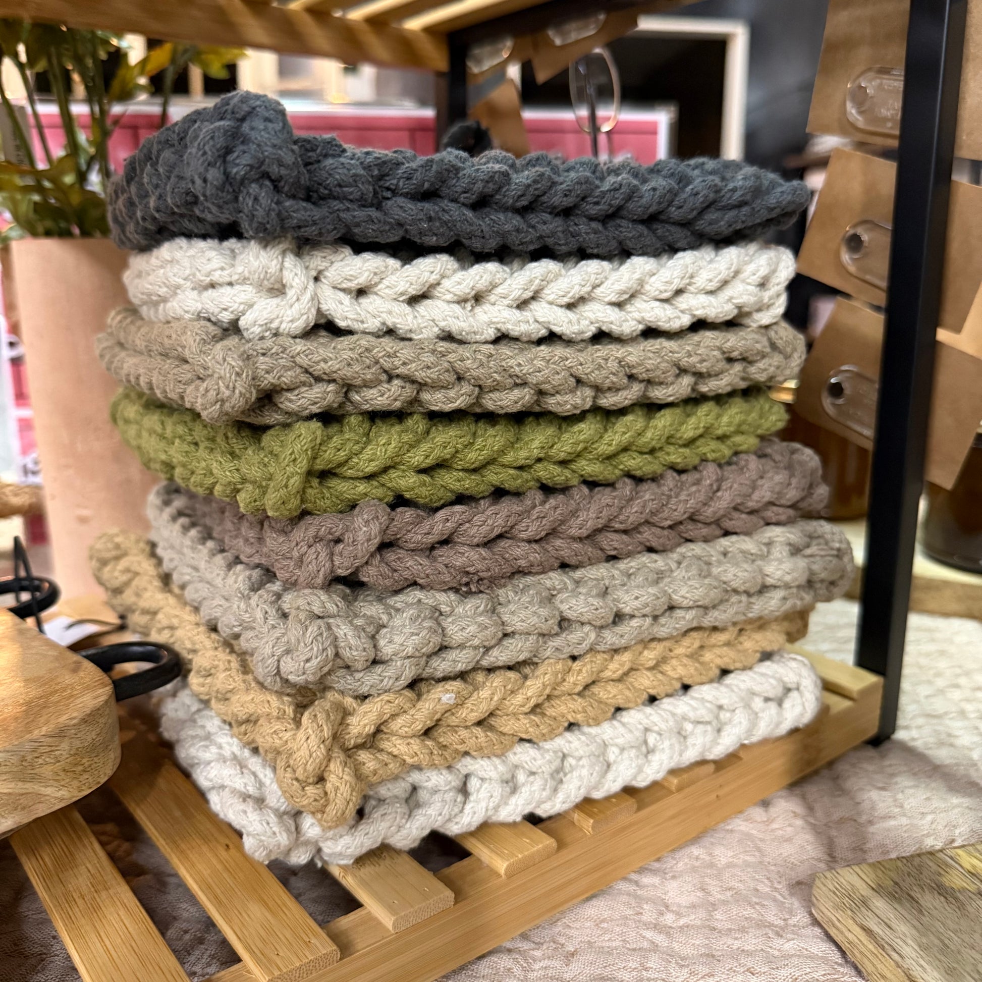 Prep your kitchen with our hand-woven Crocheted Pot Holders. They also make a wonderful housewarming gift. Made of cotton.