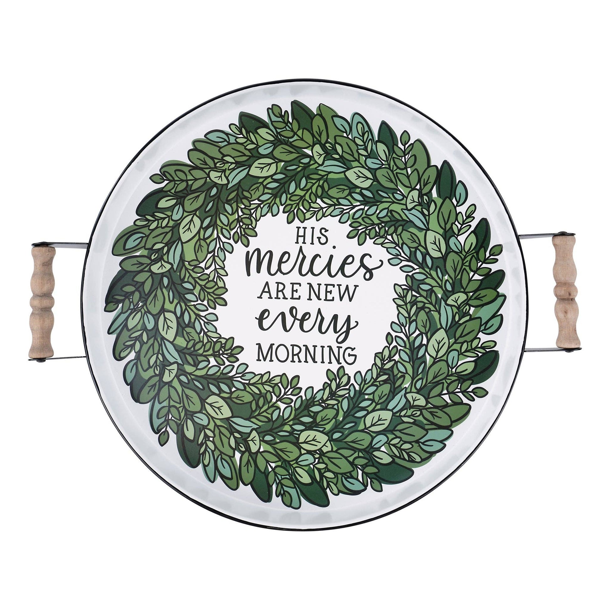This sweet serving tray is perfect for year-round decor and dishing up yummy treats or organizing busy coffee tables! Its timeless design offers a sentimental verse with "His mercies are new every morning" written in the center of a stunning greenery wreath. The side is adorned with the lovely hymn "Great Is They Faithfulness."
